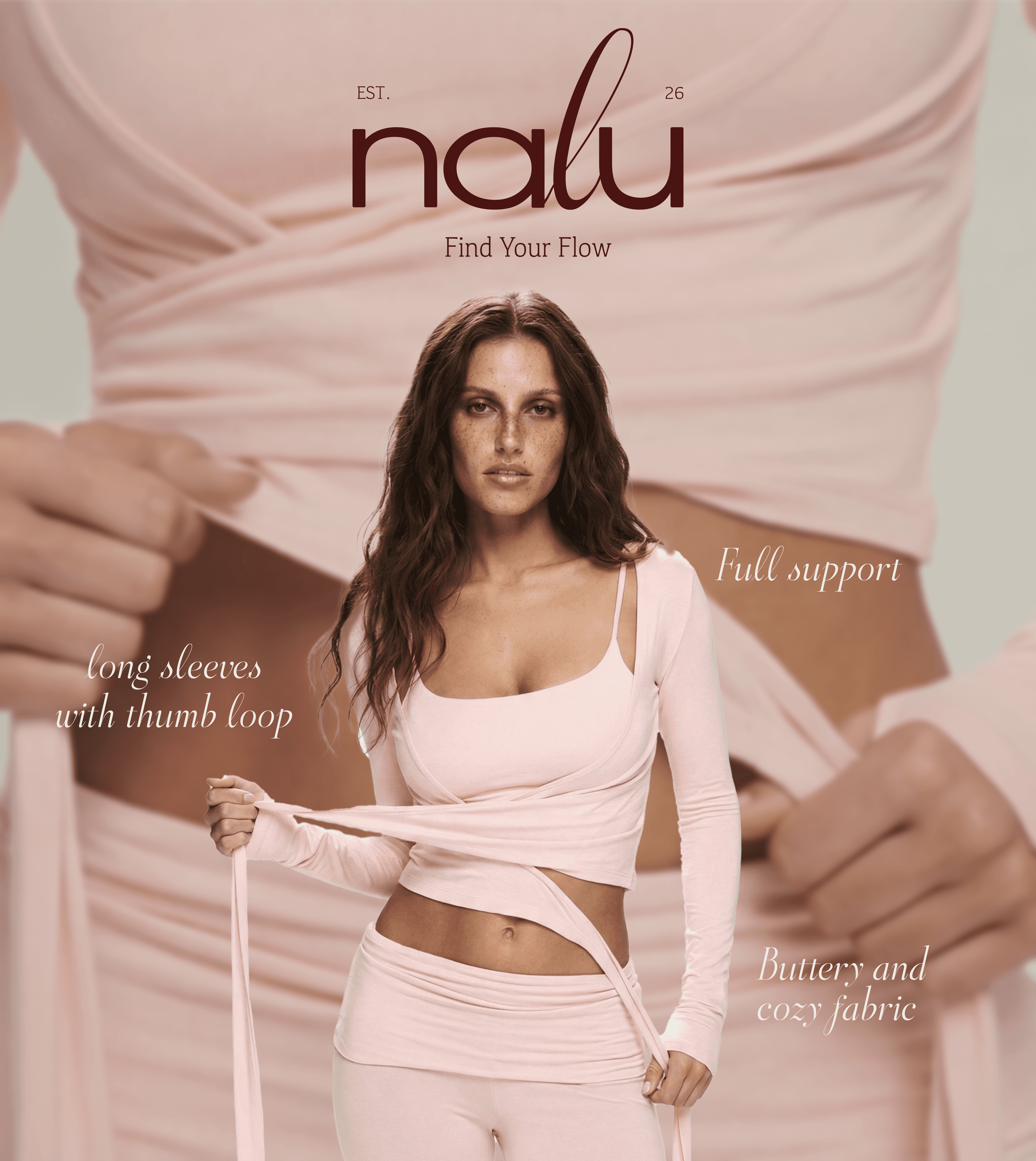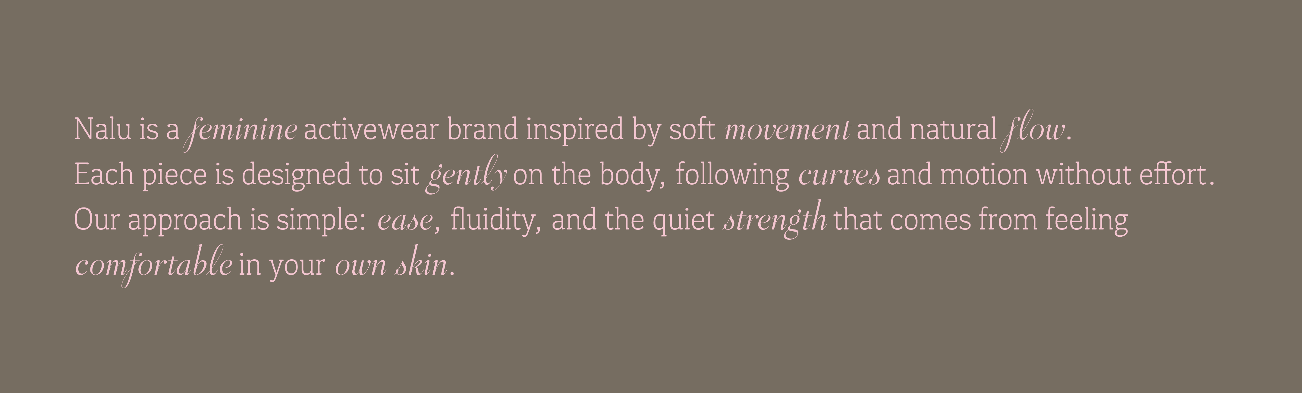 Nalu is a feminine activewear brand inspired by soft movement and natural flow. Each piece is designed to sit gently on the body, following curves and motion without effort. Our approach is simple: ease, fluidity, and the quiet strength that comes from feeling comfortable in your own skin.