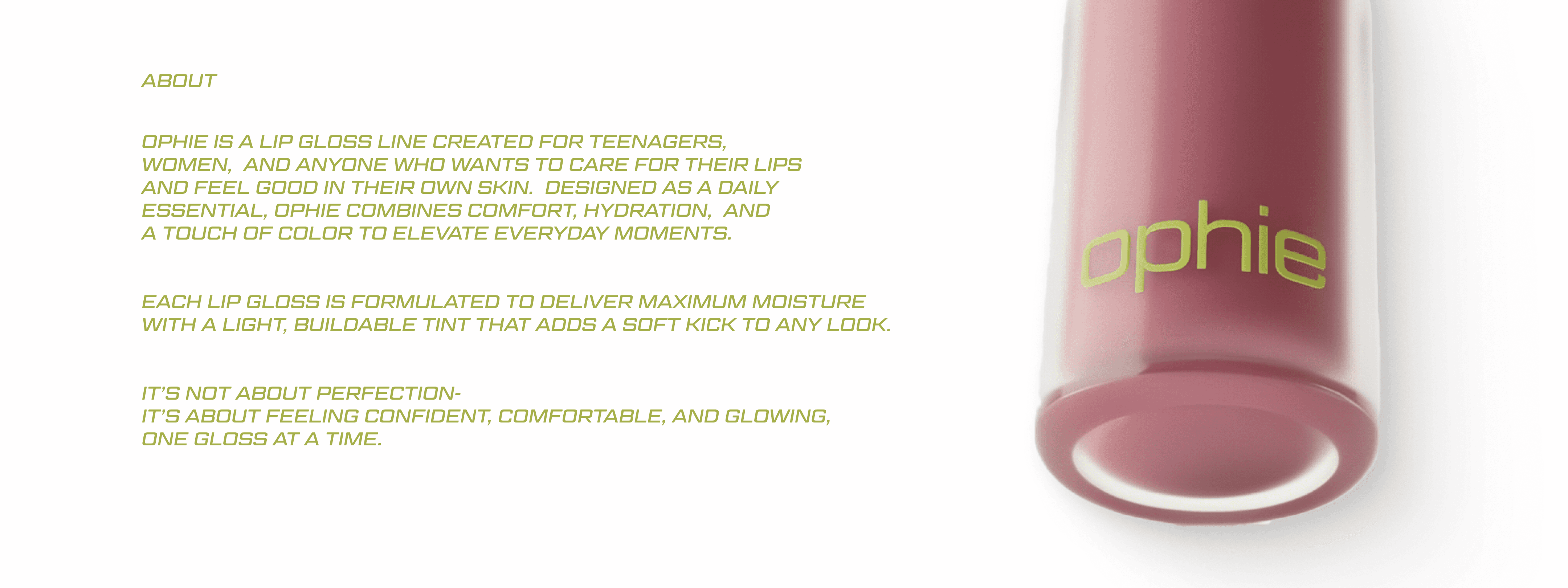Ophie is a lip gloss line created for teenagers, women, and anyone who wants to care for their lips and feel good in their own skin. Designed as a daily essential, Ophie combines comfort, hydration, and a touch of color to elevate everyday moments.